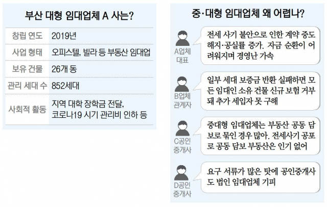 특히 부산 지역 곳곳에서 일어난 전세사기가 A업체 경영난을 부추겼다. 전세사기 불안을 느낀 기존 세입자들이 계약을 중도 해지하는 반면 신규 전세 수요자는 쉽사리 나타나지 않았다. 자금 순환이 막히자 경영이 빠르게 어려워졌다. 2019년 창립한 A업체는 부산 각지에 오피스텔 빌라 등 모두 26개 건물을 확보하고 임대업을 벌여왔다. 관리 세대만 850세대가 넘고 장학금 전달, 코로나19 시기 관리비 인하 등 사회 공헌도 활발히 해왔다.
