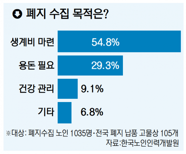 한국노인인력개발원이 진행한 ‘2023년 폐지 수집 노인 실태조사’에서 폐지 수집 노인은 월평균 소득이 15만 9000원인 것으로 나타났다. 시간당 수입은 1226원으로 2023년 최저임금 9620원 기준 13% 수준이다. 그럼에도 폐지 수집에 나서는 이유에 대해 폐지 수집 노인이나 고물상들은 ‘생계비 마련’(54.8%), ‘용돈 마련’(29.3%) ‘건강 관리’(9.1%) 순으로 응답했다.