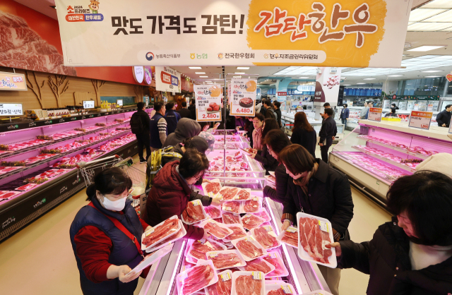 농림축산식품부는 8일부터 10일까지 전국 농축협 하나로마트에서 ‘소프라이즈 2024 대한민국 한우세일’을 진행한다. 최대 50% 할인된 가격에 한우를 구입할 수 있다. 서울 서초구 농협 하나로마트 양재점에 진열된 한우. 연합뉴스