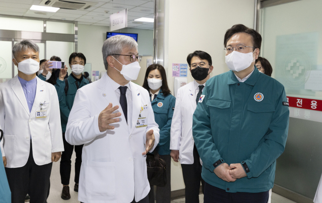 조규홍 보건복지부 장관이 7일 전북대병원을 찾아 의료진을 격려했다(위쪽). 지난 5일 전공의 공백이 계속되는 국면에 서울 한 대형병원 응급실 앞을 한 의사가 지나가는 모습. 보건복지부 제공·연합뉴스