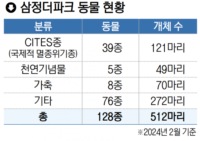 삼정더파크에는 지난달 기준 128종 512마리가 있는 것으로 파악된다. 국제 멸종위기종이 39종 121마리, 천연기념물이 5종 49마리였다.