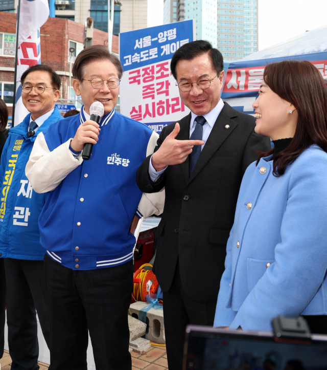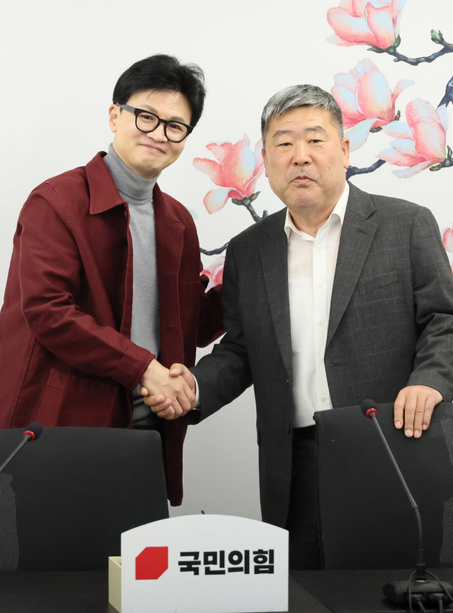 더불어민주당 이재명 대표가 7일 서울·양평 고속도로 국정농단 진상규명 촉구 농성장에서 기자회견을 하고 있다(왼쪽). 국민의힘 한동훈 비상대책위원장이 같은날 서울 여의도 중앙당사에서 김동명 한국노총 위원장와 악수하고 있다. 연합뉴스