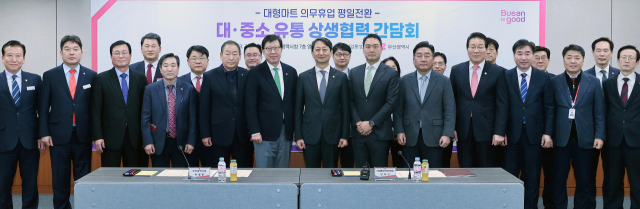 안덕근 산업통상자원부 장관이 지난 7일 부산 연제구 부산시청에서 열린 ‘부산지역 대중소유통 상생협력 간담회’에서 참석자들과 기념 촬영하고 있다. 산업부 제공
