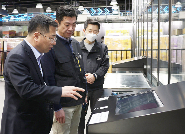 강경성 산업통상자원부 1차관이 지난달 22일 대형마트 새벽배송 전국확산을 위해 조속한 유통산업발전법 개정을 위한 현장 행보로 서울 중구 이마트 청계천점을 방문해 새벽배송 준비현황을 점검하고 있다. 산업부 제공