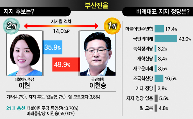 특히 이헌승 후보의 지지율은 부산진을에서 국민의힘 위성정당인 국민의미래 지지율 43.0%보다 6.9%P 높아 개인 기량이 크게 작용한 것으로 보인다. 다만 이현 후보는 민주당 지지층으로 꼽히는 3040대에서 이헌승 후보를 3.6%P, 27.9%P씩 앞서고 있어 외연 확장을 통해 충분히 반전을 노릴 수 있다는 관측도 제기된다.