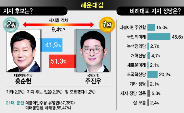 해운대갑… 지지율 과반 ‘찐윤’ 주진우, 개인기로 따라붙는 홍순헌 [4·10 총선 여론조사]