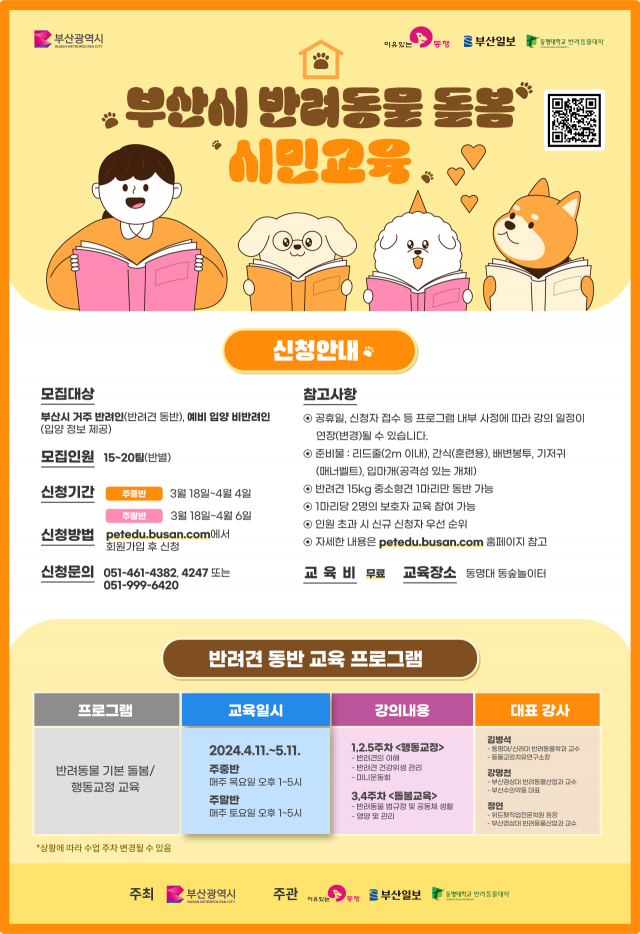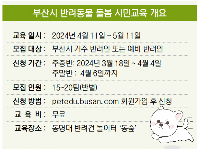 반려동물 교육의 필요성에 공감한 부산시와 이유있는 동물 동행, 부산일보는 함께 손을 잡고 오는 4월 11일부터 5월 11일까지 '반려동물 돌봄 시민교육'을 운영한다. 이번 교육을 통해 비반려인과의 갈등을 줄이고, 반려인과 반려견의 유대감을 형성해 '반려동물 친화 도시 부산' 조성에 박차를 가한다.