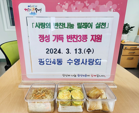부산광역시 수영구 광안4동 행정복지센터(동장 김종득)는 지난 13일 광안4동 수영사랑회(회장 오상희)에서 관내 취약계층에 따뜻한 수제 반찬을 지원하며 안부를 확인하는 「호암골 정성담은 집밥」 사업을 추진했다고 전했다.