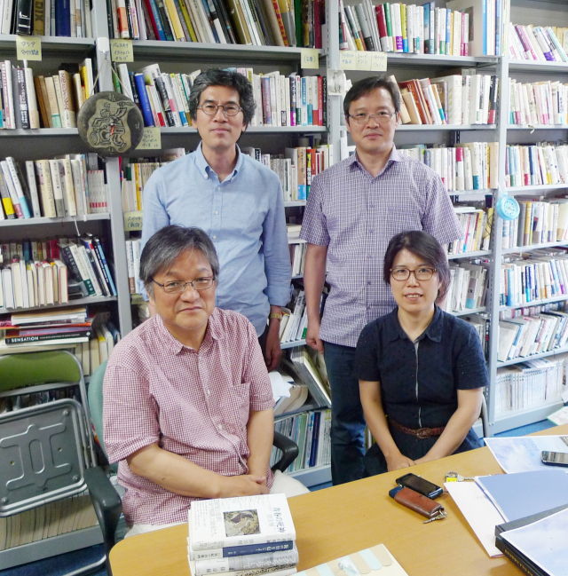 고 서경식 교수는 “문제는 식민주의다”라고 했다. 사진은 2014년 인터뷰 당시 모습으로 아래 왼쪽부터 시계 반대 방향으로 고 서경식, 서민정, 이재봉, 김용규 교수. 소명출판 제공