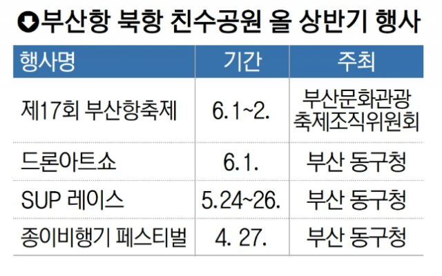 부산문화관광축제조직위원회(축조위)에 따르면 올 6월 1일부터 이틀간 북항 친수공원에서 ‘제17회 부산항축제’를 연다. 축조위는 친수공원 내 수로를 활용한 보트 체험과 드론 라이트쇼, 불꽃쇼 등을 선보일 예정이다. 관할 지자체인 부산 동구청도 올 상반기 북항 친수공원에서 △종이비행기 페스티벌(4월 27일) △스탠드업 패들보드(SUP) 레이스(5월 24~26일) △드론아트쇼(6월 1일)를 개최할 예정이다.
