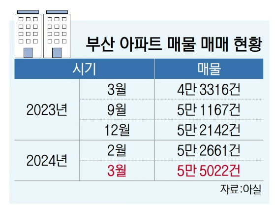 17일 부동산 빅데이터업체 아실에 따르면 이날 기준 매매를 위해 내놓은 부산 아파트 매물 건수는 5만 5022건으로 1년 전(4만 3316건)에 비해 27% 증가했다. 관련 통계가 작성된 2021년 4월 이후 매물량이 5만 5000건을 넘긴 건 이번이 처음이다.