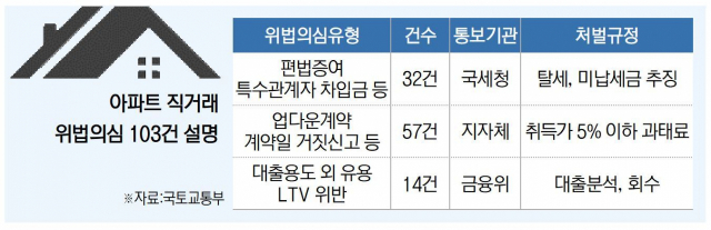 이와 함께 아파트 매매거래를 할 때 공인중개사가 아닌 당사자끼리 직거래한 경우를 조사한 결과, 103건의 위법 의심거래가 적발돼 국세청과 금융위 등에 처분을 요구했다.
