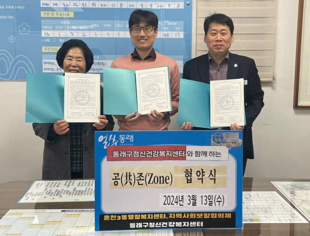 부산 동래구 온천3동 행정복지센터는 지난 13일 동래구 정신건강복지센터, 온천3동 지역사회보장협의체와 ‘생명사랑 환경조성 사업공존’ 협약을 체결했다. 동래구청 제공