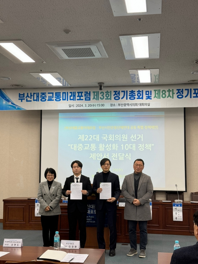 세미나에 앞서 포럼은 제22대 총선을 앞두고 대중교통 활성화를 위한 10대 정책을 발표하고, 이를 각 정당과 후보에게 제안하는 전달식을 진행했다.