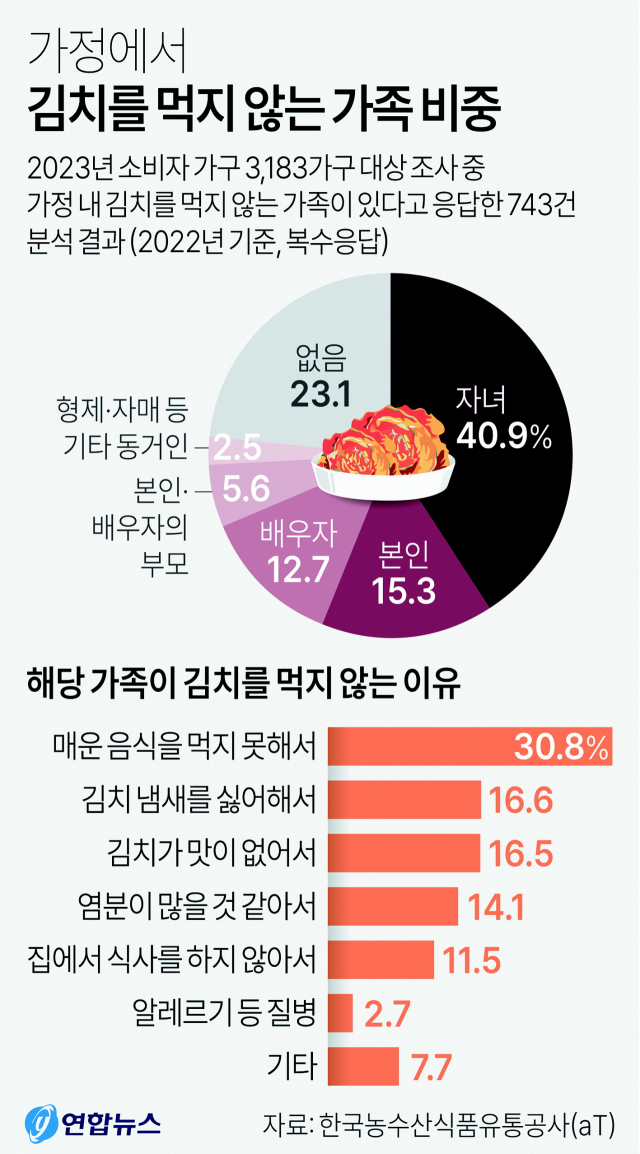 가정에서 김치를 먹지 않는 가족이 있는 경우, 그 이유로는 매운 음식을 먹지 못해서(30.8%)가 가장 많았고 김치 냄새를 싫어해서(16.6%), 김치가 맛이 없어서(16.5%), 염분이 많을 것 같아서(14.1%) 등 순으로 응답했다. 또 가정 내 김치 섭취가 줄고 있다는 응답이 42.7%로, 늘고 있다(6.0%)는 응답의 7배가 넘었다. 큰 변화 없다는 51.3%였다.