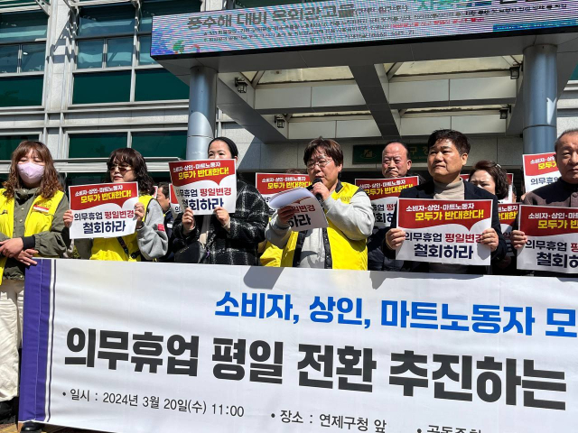 이날 기자회견에는 마트 노동자들도 참석해 의무 휴업일을 일요일에서 평일로 변경하는 건 노동자 건강권과 생존권을 빼앗는 일이라고 주장했다. 이들은 “지금도 마트 노동 환경이 열악한데, 일요일 2회 쉬는 것까지 폐지하면 어떻게 복지를 증진하겠다는 것인가”라고 목소리를 높였다.