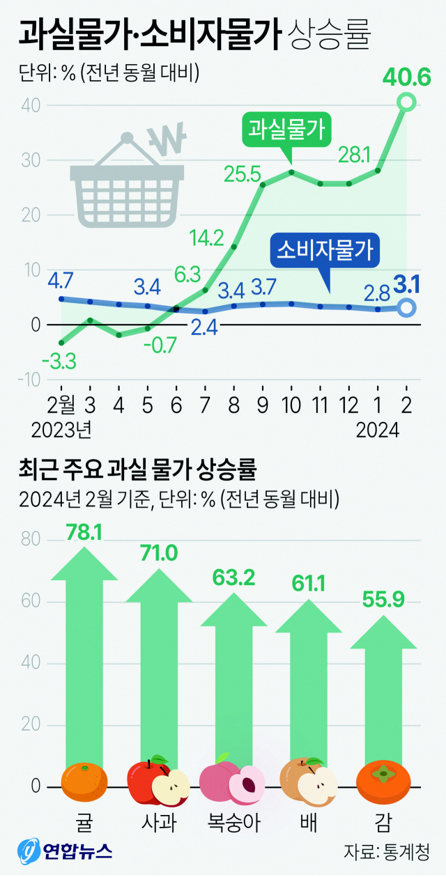 다른 과일 가격도 무섭게 치솟고 있다. 지난달 복숭아 가격 상승률이 역대 최고를 기록했고, 배는 외환위기 이후 최고 상승률을 보였다. 귤, 딸기도 사정은 마찬가지다. 과일 전체로 따지면, 지난달 상승률이 40.6%로 1991년 9월(43.7%) 이후 가장 높은 수준을 보였다.