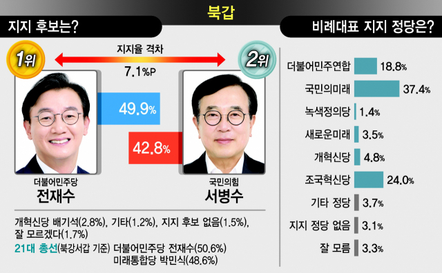 북갑의 정당 지지율을 살펴보면 민주당 지지율은 36.2%로 국민의힘(44.3%)보다 열세다. 전 의원은 이 같은 정치 지형 속에서도 13%P 이상의 지지율을 오롯이 개인기로 얻어냈다는 의미다.