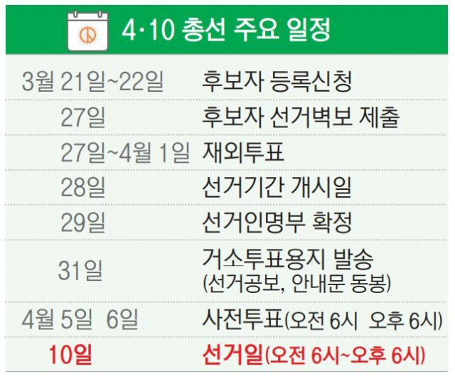 이날 후보 등록을 시작으로 여야는 국회의원 300명을 뽑는 총선 총력전에 돌입했다. 공식 선거운동은 오는 28일부터 가능하다. 공식 선거운동 기간은 오는 28일부터 총선 전날인 4월 9일까지다. 공식 선거운동 기간 전까지는 예비 후보자에게 허용된 방식으로만 일정 범위 내에서 선거운동이 가능하다.