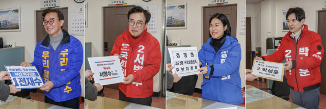 4·10총선 후보자 등록이 시작된 21일 부산 북구선거관리위원회에서 북갑, 북을 선거구 후보들이 등록 서류를 제출하고 있다. 왼쪽부터 더불어민주당 전재수, 국민의힘 서병수, 더불어민주당 정명희, 국민의힘 박성훈 후보. 김종진 기자 kjj1761@