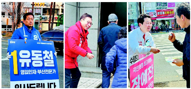 부산 수영 4·10 총선에 출마한 더불어민주당 유동철, 국민의힘 정연욱, 무소속 장예찬 후보가 거리에서 시민들에게 인사를 하고 있다. 국민의힘 공천 취소 결정으로 인지도를 앞세운 장 후보가 무소속으로 출마하면서 수영 총선 결과에 이목이 쏠린다. 각 후보 제공