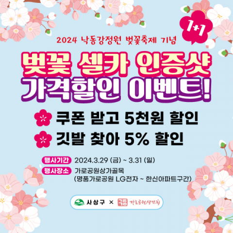 ‘벚꽃 셀카 인증샷, 가격할인 이벤트 1+1’은 ‘2024년 낙동강정원 벚꽃축제’기간 동안 낙동제방 일원 벚꽃길 축제 방문객이 인근 가로공원 상가를 방문하면 5천 원 할인과 추가 5% 할인을 1+1으로 제공하는 행사다.