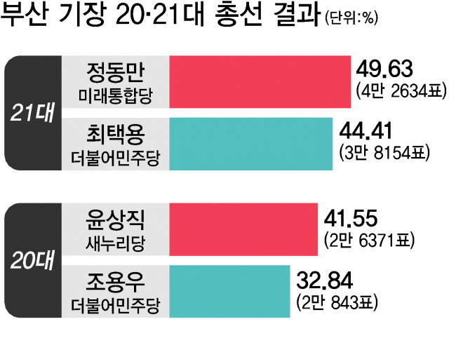 기장은 지난 20대 총선을 앞두고 인구 상한선 돌파로 단독 선거구를 이뤘다. 20대(새누리당 윤상직)에 이어 21대에 정 후보가 국회에 입성하며 기장은 ‘보수 진영 안심지역’으로 여겨졌다. 다만 이후 신도시 개발로 젊은 층이 점차 유입되면서 기류는 조금씩 달라졌다. 지난 총선에선 최 후보가 원외 후보 최소 표차로 44.41%의 지지율을 얻으며 정 후보(49.63%)를 따라붙기도 했다. 20대 총선에서 9%포인트 가까이 벌어졌던 표차가 좁혀진 것이다.