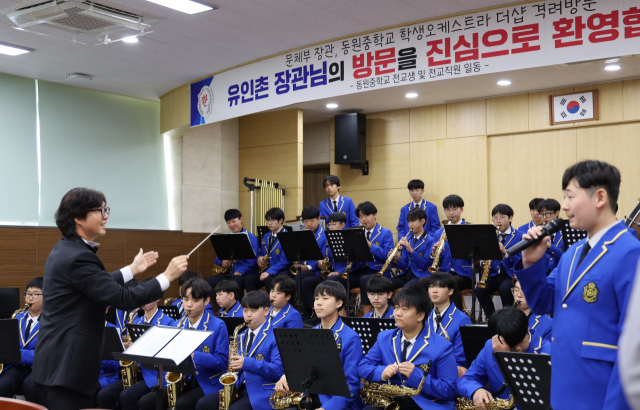 통영국제음악제 개막공연에 앞서 동원중을 찾은 유 장관은 학생 색소폰 오케스트라 동아리 ‘더샵(The #)’ 공연을 관람하고 학생들과 간담회를 진행했다.