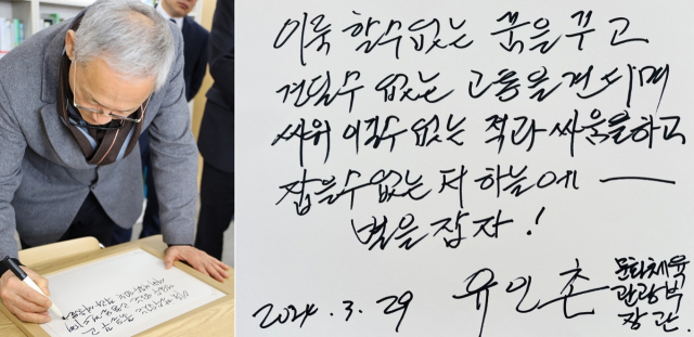 이어 도서관에 들른 유 장관은 격려 문구를 남긴 뒤 “최고의 교육환경에 미래교육 대비도 우수하다”고 평가했다. 계속된 학생과 간담회에선 예술에 대한 심도 깊은 대화를 나눴다. 특히 영화 관련 질문에 “영화는 세상을 섬세하고 자세하게 표현하는 매체다. 선정적이고 폭력적인 영화는 멀리하고 좋은 영화들을 많이 보길 바란다. 무엇보다 음악 관련 영화를 추천한다”고 답했다.