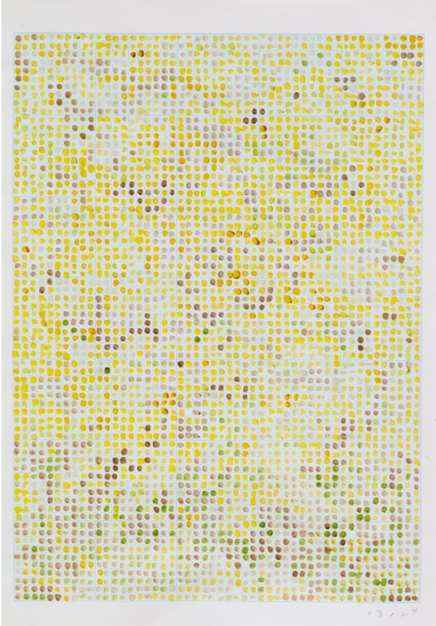 박형진은 시간에 따라 변화하는 풍경을 모눈종이 위에 색으로 기록하는 작가이다. 시간과 계절에 따른 개나리의 변화를 볼 수 있는 56개의 회화 연작이다. 작가는 집과 작업실을 오가며 지속적으로 본 서울 응봉산 근린공원 속 개나리의 변화를 봄이 끝날 무렵까지 기록했는데, 이 과정에서 사용되는 모눈종이 칸(그리드)들은 작가에게 있어서 일종의 시간 단위이다. 즉, 그녀는 특정 시간에 나무의 색을 채집하고, 여러 안료를 섞거나 직접 조색작업을 해 본인의 그리드 위에 그 색을 구현해 기록했고, 그리드를 빼곡히 채운 색채는 눈에 보이는 자연과 나무의 색이기도 하지만, 작가가 경험한 시간 그 자체이기도 하다는 말이다. ▶4월 13일까지 오케이앤피의 스페이스 토핑.