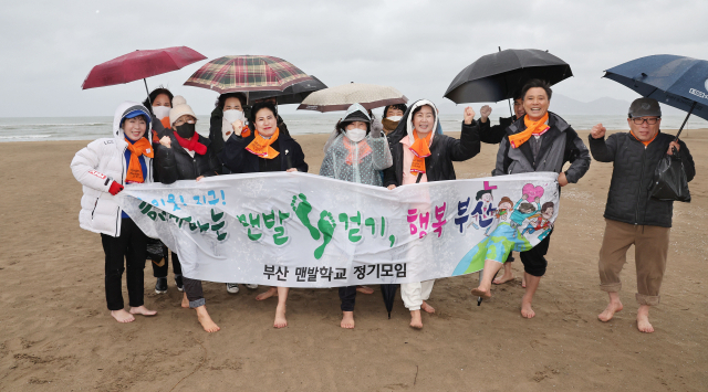부산맨발학교 회원들이 최근 부산 사하구 다대포해수욕장 백사장을 걷고 있다. 정종회 기자 jjh@