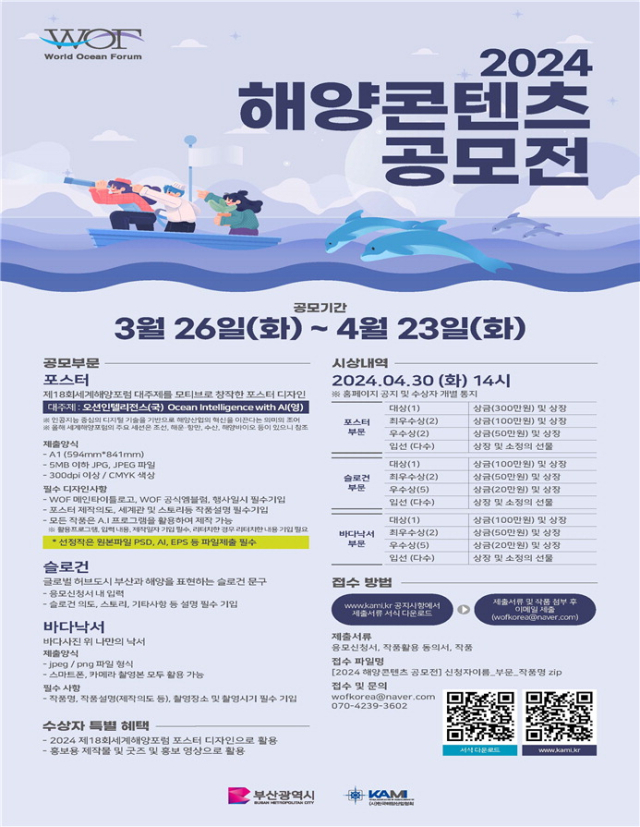 WOF 주관사인 (사)한국해양산업협회는 부산시와 함께 ‘2024 해양콘텐츠 공모전’(사진)을 진행한다고 31일 밝혔다.