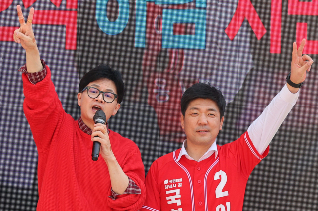 인천 계양을에 출마한 더불어민주당 이재명 대표가 31일 계양구 서운동성당 앞에서 배우 이기영 씨와 함께 선거 유세를 하고 있다(위). 국민의힘 한동훈 비상대책위원장 겸 총괄 선거대책위원장이 이날 경기 하남시 위례 스타필드시티 앞에서 하남시갑 이용 후보의 지지를 호소하고 있다. 연합뉴스