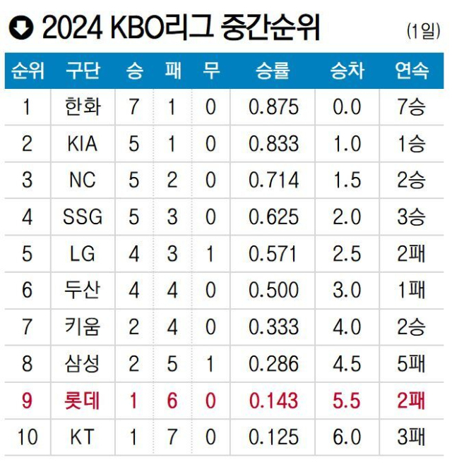 반면, 롯데는 아직 제대로 날개를 못 펴고 있다. 개막 4연패를 포함해 초반 7경기에서 6패를 떠안으며 최하위권으로 처졌다. 매년 시즌 초만큼은 호성적으로 ‘봄데’란 별칭을 얻은 롯데지만, 올해는 2018년 개막 7연패 이후 6년 만에 다시 추운 봄을 맞이했다.