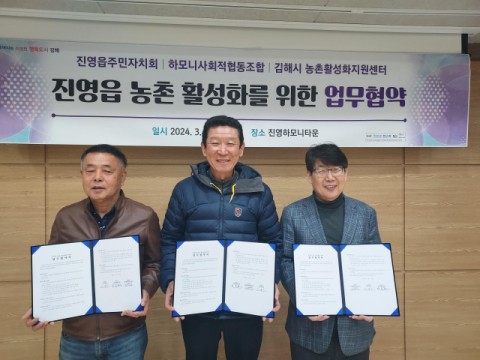 김해시는 지난 28일 진영읍 진영하모니타운 대강당에서 진영읍 주민자치회(회장 이생우), 하모니사회적협동조합(이사장 안종현), 김해시 농촌활성화지원센터(센터장 김한도)가 ‘진영읍 농촌 활성화를 위한 다자간 업무협약(MOU)’를 체결했다고 1일 밝혔다.