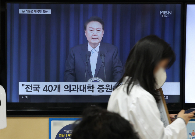 1일 오전 서울 한 대형병원에서 내원객과 환자들이 윤석열 대통령의 의료 개혁 관련 대국민 담화를 지켜보고 있다(위). 이날 김성근 의협비대위 언론홍보위원장이 서울 용산구 의사협회에서 열린 정례브리핑에서 윤 대통령의 대국민 담화와 관련해 입장을 설명하고 있다. 연합뉴스