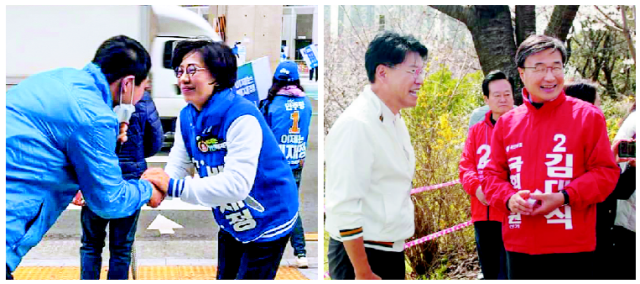 국민의힘 김대식 후보는 대통령직 인수위원, 국민권익위 부위원장 등을 지내 중앙과의 네트워크가 화려하다. 여기에다 불출마한 장 의원의 선거 조직과 지지세를 고스란히 물려받았다. 두 사람은 연일 선거유세로 호흡을 맞추며 국민의힘 지역구 사수를 외치는 중이다. 오전 5시가 되기도 전에 집을 나서는 김 후보는 “김대식이 스무 명 정도만 있으면 얼마나 좋겠느냐”며 웃었다. 이어 그는 “사상 발전을 위한 큰 틀은 장 의원이 이미 짜둔 상태로 이제 12개 동 구석구석을 돌며 가려운 부분을 긁어줘야 할 시간”이라고 말했다. 두 후보가 각각 문 전 대통령과 장 의원의 지지를 받는다는 점에서 사상 선거는 후보 간의 대결보다 진영 간의 격돌로 보는 시각이 많다. 실제로 연일 이어진 장 의원의 지원 유세에 대항하듯 문 전 대통령도 1일 사상을 찾으며 화제를 낳았다. 사상은 〈부산일보〉와 부산MBC의 공동 의뢰로 한국사회여론연구소(KSOI)가 지난달 18~19일 사상 지역 유권자 501명을 대상으로 실시한 여론조사(무선 자동응답 ARS 조사 방식, 표본오차는 95% 신뢰수준에 ±4.4%포인트, 자세한 내용 중앙여론조사심의위원회 홈페이지 참조)에서 초접전 지역으로 분류됐다. 배 후보는 46.0%, 김 후보는 46.3%의 지지율을 얻었다.