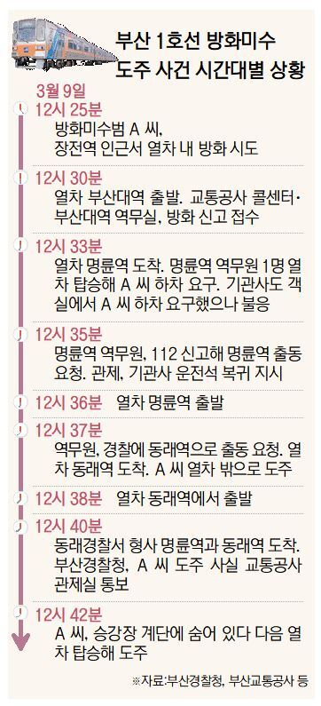 두 정거장을 지나 명륜역에서 역무원 1명이 열차에 탑승해 A 씨에게 3분가량 하차를 요구했다. 하지만 A 씨가 욕설을 퍼부으면서 저항하자 역무원과 A 씨를 태운 열차는 동래역으로 이동했다. 동래역에서 A 씨는 하차 후 승강장에 숨어 있다가 다른 열차를 타고 도주했다. A 씨는 다음날 1호선 부산역에서 전날 방화에 사용했던 종이와 라이터를 소지한 채 경찰에 붙잡혔다.