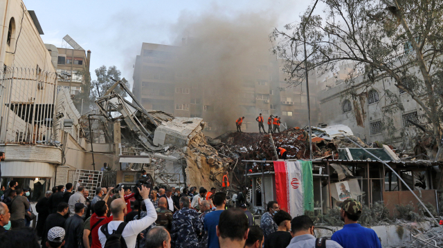 1일(현지시간) 구조대원들이 이스라엘군의 폭격으로 파괴된 시리아 다마스쿠스 주재 이란 영사관 건물에서 구조 활동을 벌이고 있다. 이날 폭격으로 이란 혁명수비대(IRGC) 고위 간부 등 여러 명이 숨졌다. EPA연합뉴스