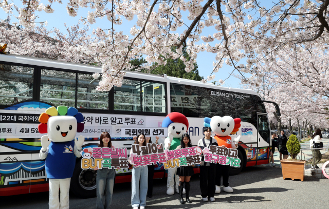 부산시선관위가 지난 1일 22대 총선 투표 참여율을 높이기 위한 캠페인을 벌이고 있다. 정종회 기자 jjh@