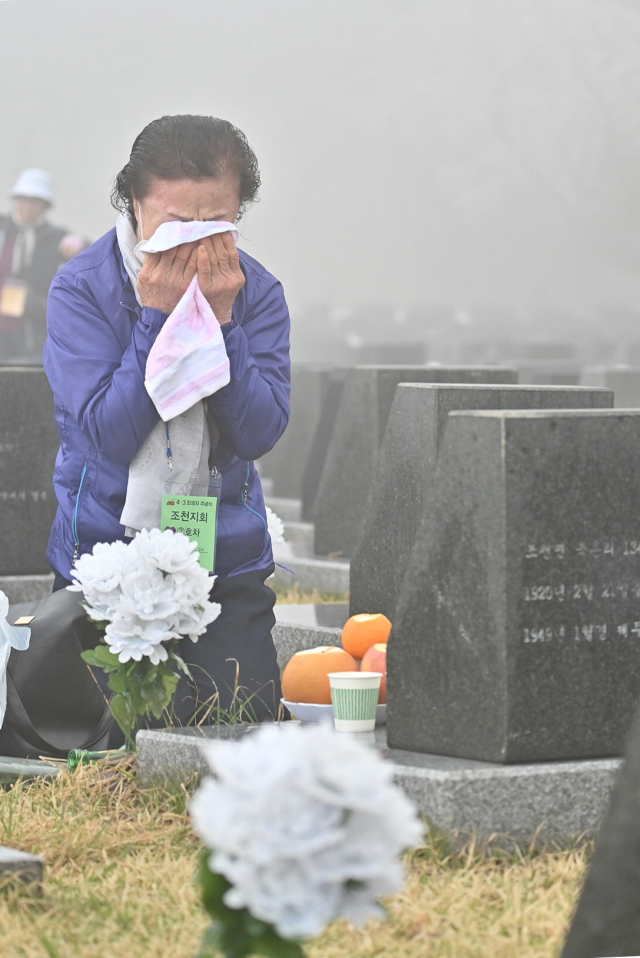제주4·3희생자추념일인 3일 제주시 봉개동 4·3평화공원 내 행방불명인 표석을 찾은 유족이 희생자의 넋을 기리고 있다. 연합뉴스