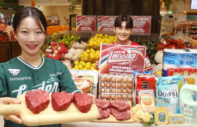 서울 이마트 용산점에서 모델들이 ‘랜더스데이’ 행사를 홍보하고 있다. 행사카드로 결제하면 한우 구이용 전품목을 최대 50% 할인된 가격에 살 수 있다. 연합뉴스