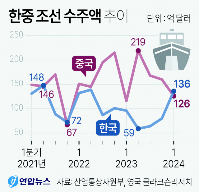 올해 1분기 우리나라의 선박 수주액이 136억 달러로 중국을 앞지르며 세계 1위를 달성했다.
