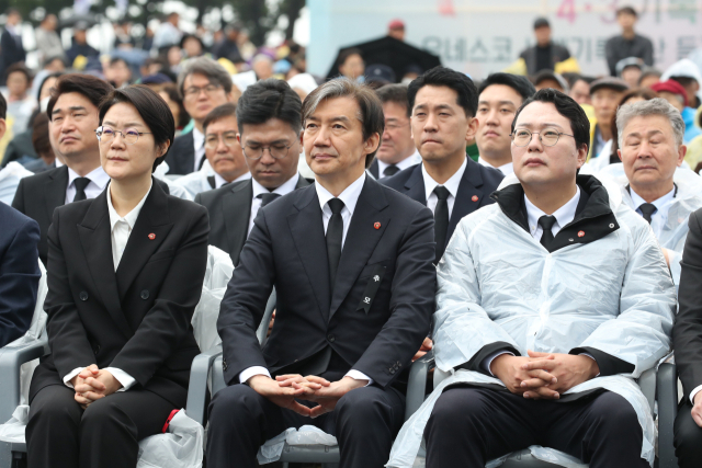 진보당 윤희숙(왼쪽부터) 상임대표와 조국혁신당 조국 대표, 개혁신당 천하람 총괄선대위원장이 3일 제주에서 열린 제76주년 제주 4·3희생자 추념식에 참석하고 있다. 연합뉴스