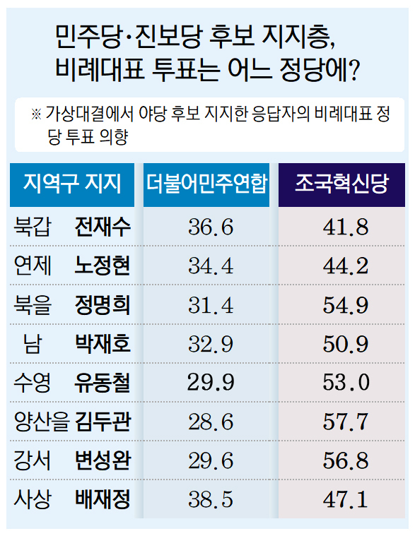 부산 강서에서도 민주당 변성완 후보를 지지한다고 밝힌 응답자 가운데 29.6%만이 더불어민주연합에 투표 의향을 밝혔다. 변 후보 지지자의 56.8%는 조국혁신당에 투표하겠다고 밝혔다. 부산 북을에서도 민주당 정명희 후보 지지자 가운데 31.4%만 더불어민주연합에 투표하겠다고 밝혔고 54.9%는 조국혁신당에 투표하겠다고 밝혔다. 이번 조사에서 지역구 야당 후보 지지자 가운데 비례대표 투표에서 더불어민주연합에 투표하겠다는 응답이 조국혁신당보다 높은 지역은 단 한 곳도 없었다.