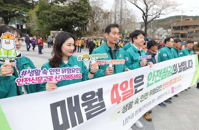 2024년 안전점검의 날을 맞아 부산시 안전정책과와 부산진구청 안전도시과 직원들이 4일 부산 부산진구 어린이대공원 일대에서 자율안전점검 요령을 홍보하기 위한 캠페인을 펼치고 있다.