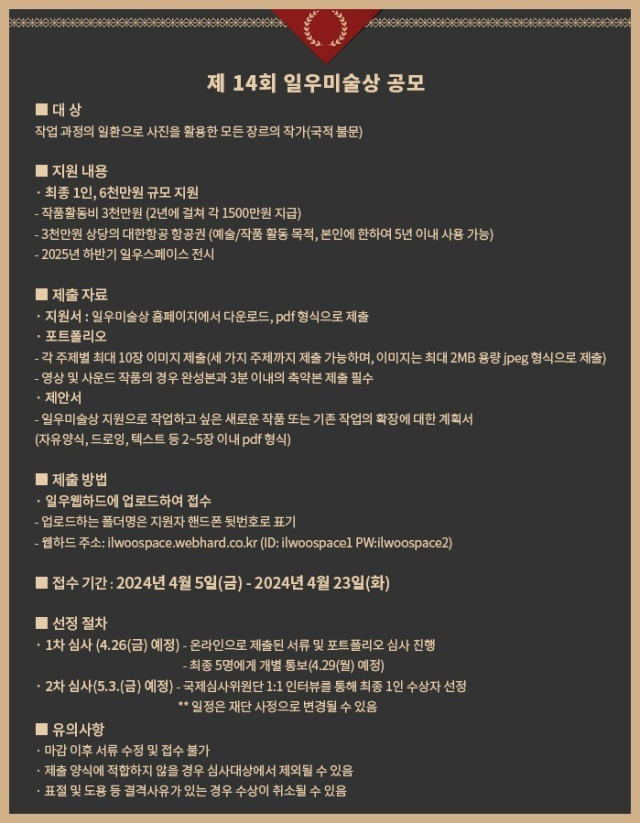 제14회 일우미술상 공모는 4월 5일부터 4월 23일까지이며, 응모방법은 지원서와 각 주제별로 구성한 포트폴리오, 향후 작업 방향 내용을 담은 제안서를 일우미술상 홈페이지에서 확인할 수 있다.