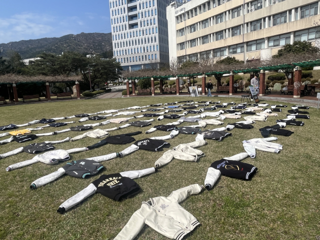 5일 오전 9시 부산 금정구 장전동 부산대 사회관 정원 잔디밭에 부산대 학과 점퍼 70여 개가 놓여 있다. 양보원 기자