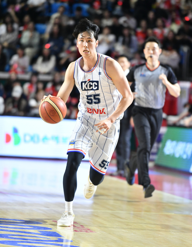 KCC 송교창이 6일 KBL 6강 플레이오프 2차전에서 SK 진영을 향해 드리블을 하고 있다. KBL 제공