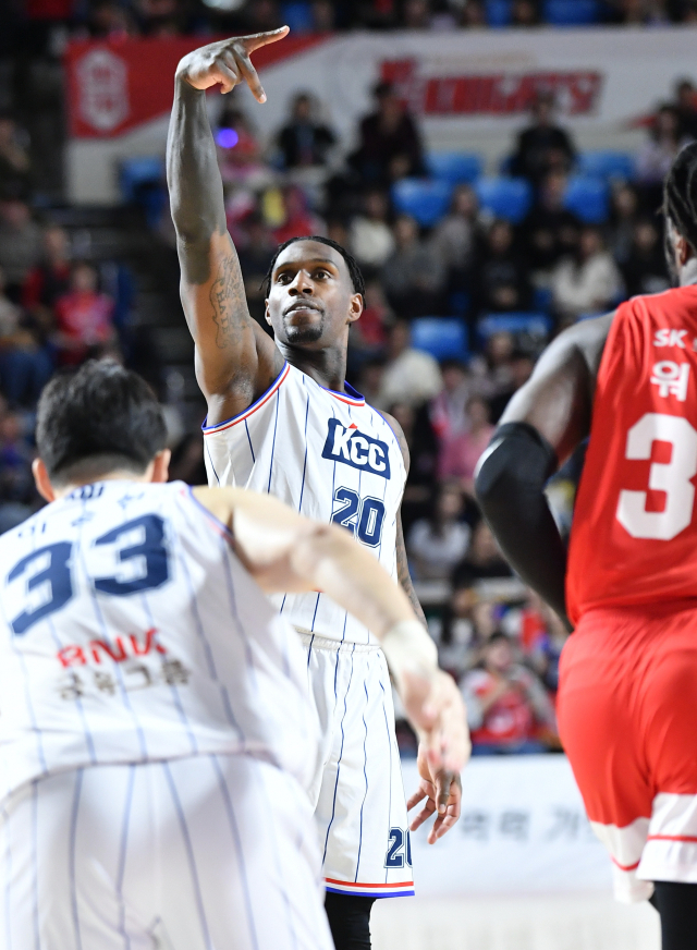 KCC 라건아가 6일 KBL 6강 플레이오프 2차전에서 3점슛을 성공한 뒤 세리머니를 하고 있다. KBL 제공